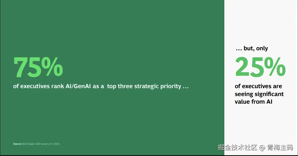 - 战略优先级 vs 实际收益:75%高管将AI列为Top 3战略,但仅25%看到显著价值(BCG Rules 2025)
