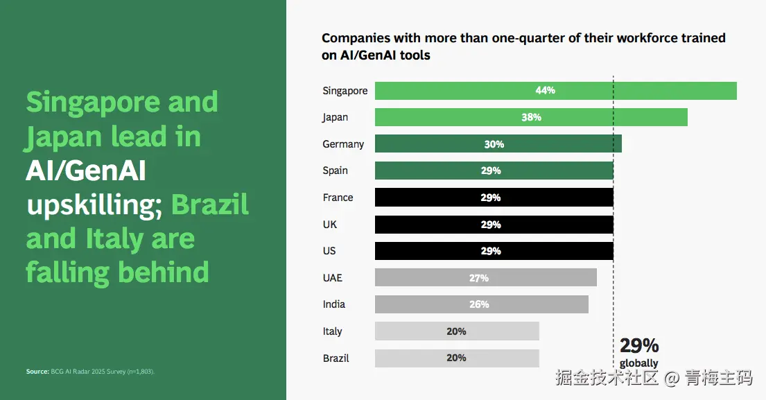 - 培训缺口:70%公司培训覆盖率不足25%,新加坡(44%)、日本(38%)领先(BCG AI Rules 2025)