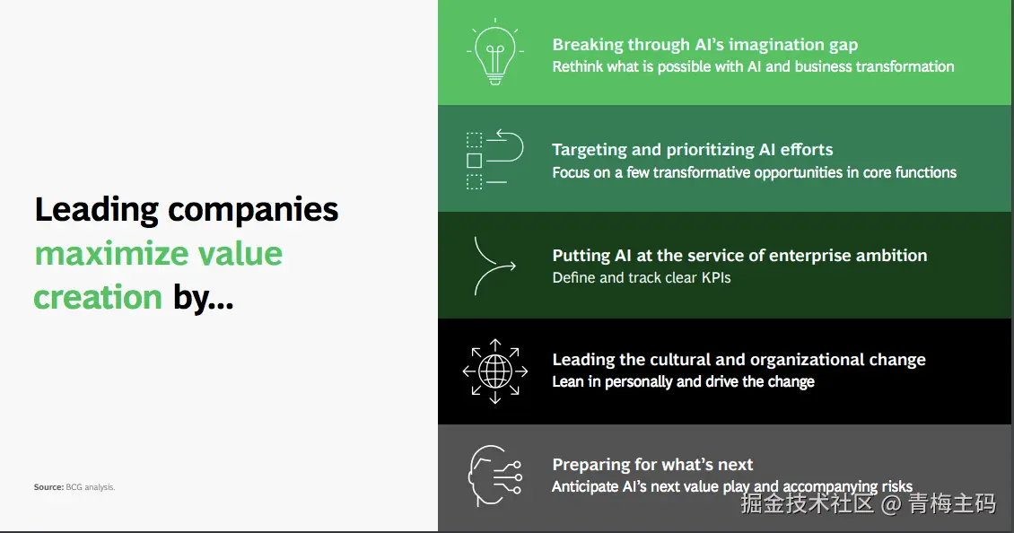 - ROI差距2.1倍:领先企业AI收益预期是其他公司的2.1倍,因其更聚焦高价值场景(BCG Build for the Future 2024)