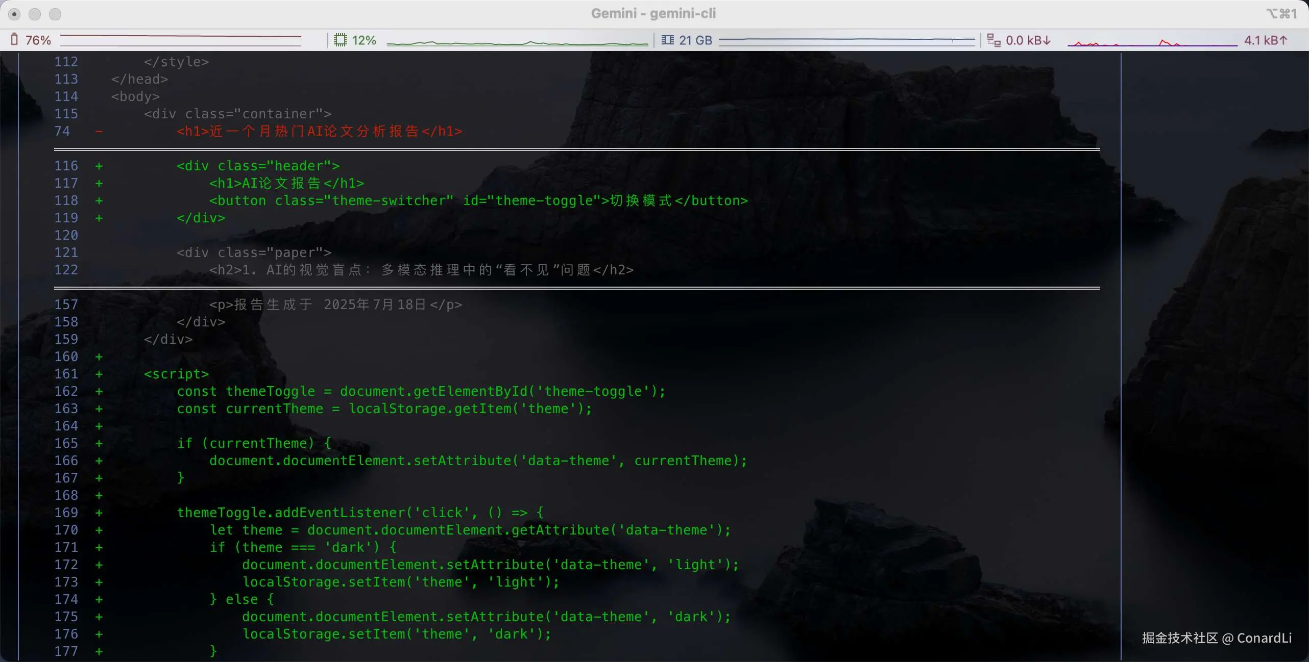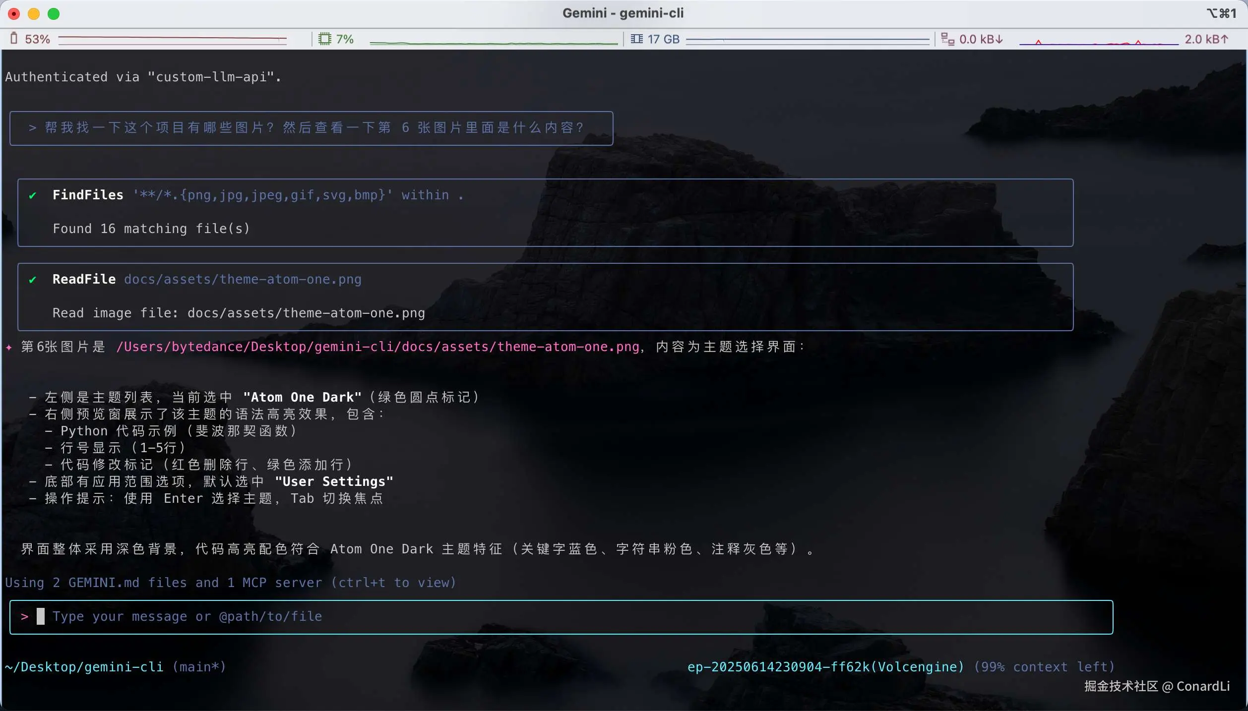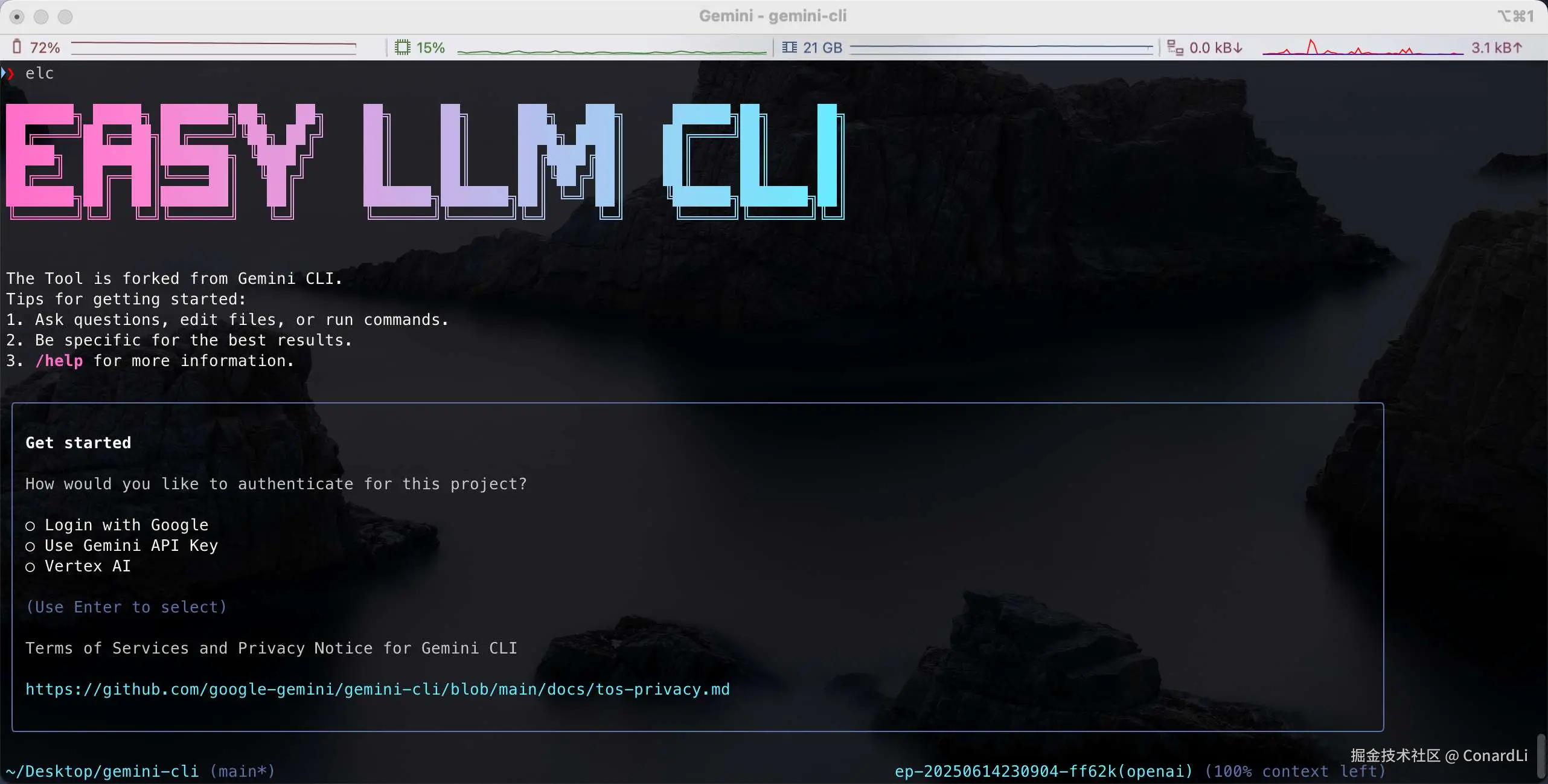 下面我们直接来看我对 Gemini CLI 的改造版本:Easy LLM CLI ,简称 ELC,目前我也把改造后的代码直接开源了(github.com/ConardLi/ea…