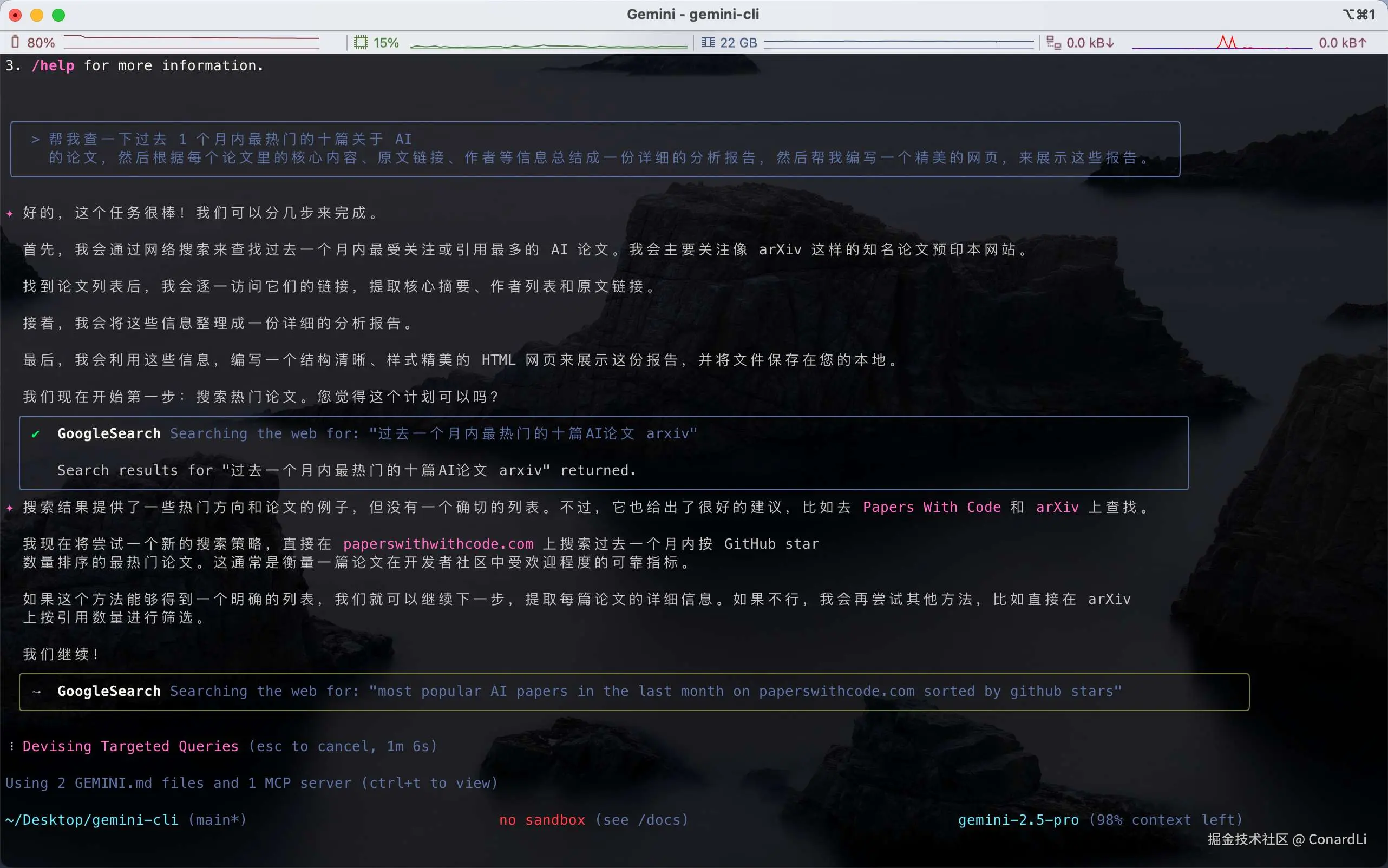 Gemini CLI 默认内置了 Google Search 工具,可以根据我们的需求智能检索相关内容: