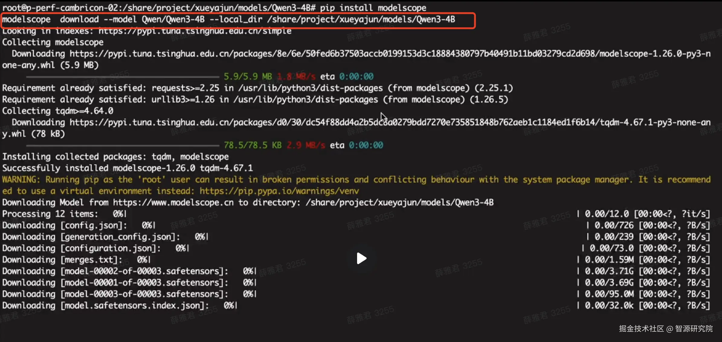 以下以Qwen3-4B-flagos模型在寒武纪使用为例讲解,其他厂商和模型同理。