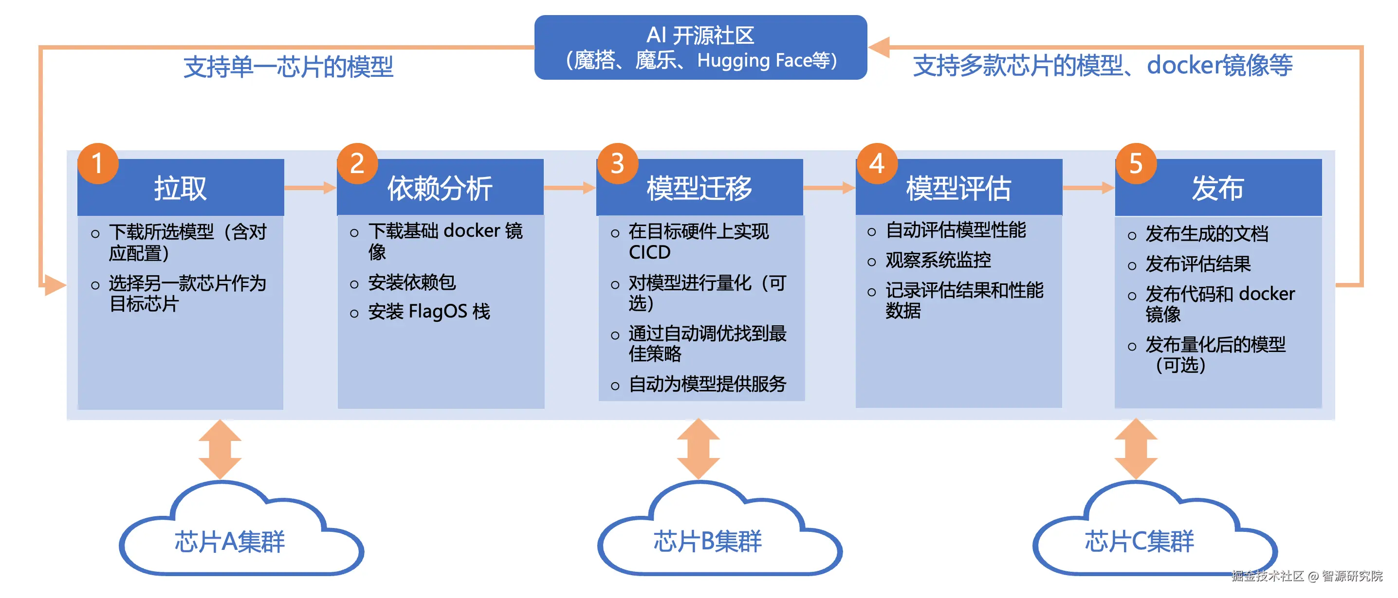 为了让开源大模型人人可用、多种硬件可运行,降低人工智能计算的门槛,智源研究院研发了面向多种AI芯片的大模型自动迁移、多芯片发版平台 FlagRelease。依托统一、开源的AI系统软件栈FlagOS提供的跨芯适配能力,FlagRelease 打造了一套将大模型自动迁移至不同硬件架构、自动评测迁移结果、内置自动部署调优功能并自动发布模型多芯版本的标准流程。用户可从魔搭或Hugging Face的FlagRelease入口找到所需开源大模型对应的不同芯片版本,下载即可直接使用,无需迁移。FlagRelease彻底改变了AI模型与多元异构硬件的关系,让模型发展不再受制于硬件生态壁垒。