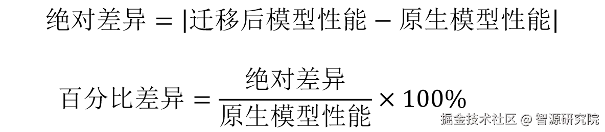 具体而言,从知识应用、复杂推理、代码生成、数学能力等多个维度对模型进行系统性评测。为确保评测标准的一致性和科学性,测试过程中严格统一所使用的数据集、参数设置及评测脚本。此外,为保证评测结果的可量化和可对比,采用绝对差异和百分比差异两种指标,分别描述迁移后模型与原生模型之间的性能变化,计算方法如下: