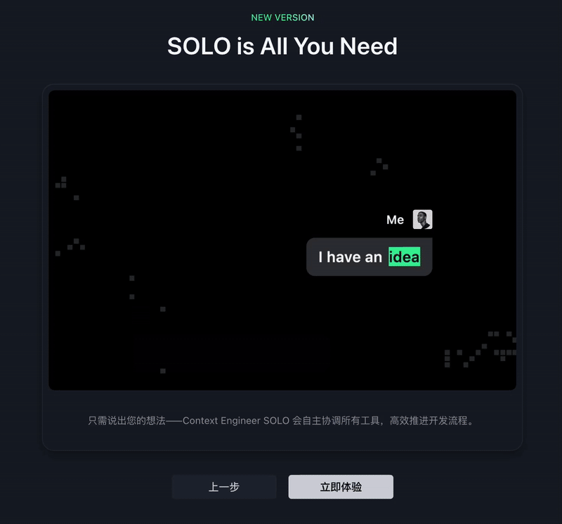 你有一个绝妙的产品想法,Solo 模式能让你通过几轮对话的方式直接将你的想法写成具体的需求文档,变成可交互的 MVP 原型,甚至是一个能工作的网站,几分钟就能搞定,而不是几周,这个大家应该都能了解。