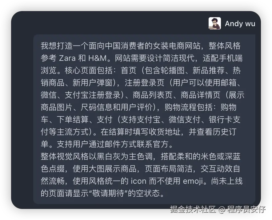 第一个案例是官方的示例,就一个问题搭建一个针对女装的电商平台项目出来,原问题如下: