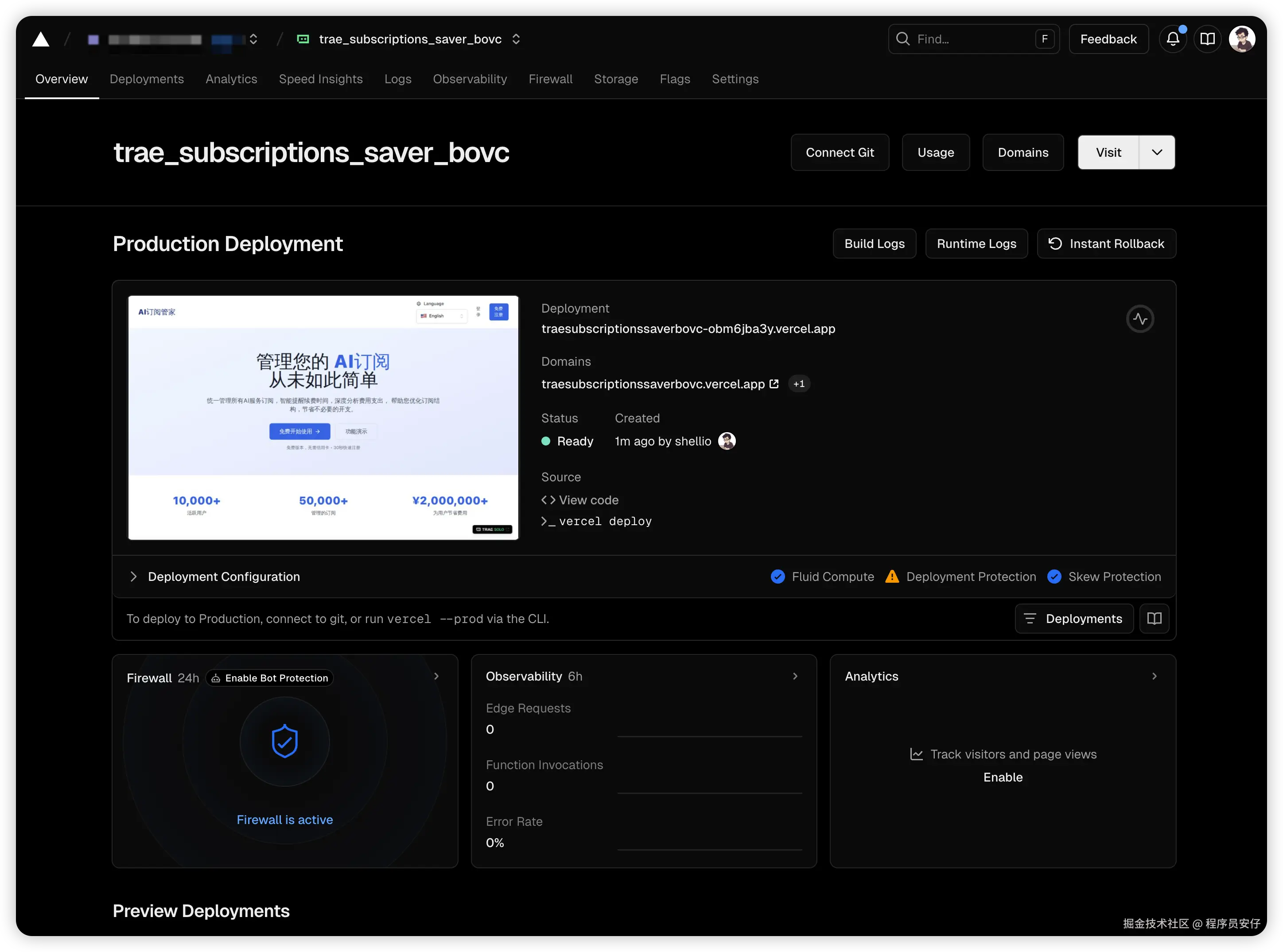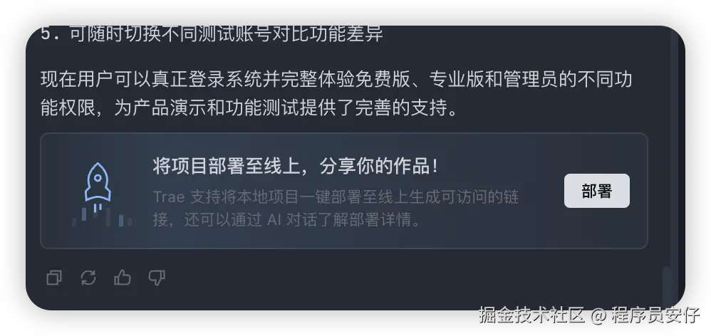 它基本帮我想要的功能补全了!而且该有的效果也能交互出来,而且我还忘了说这次 Trae Solo 的一点时,你生成好的产品是可以直接部署到公网的!默认选择的是发布到 Vercel 平台上: