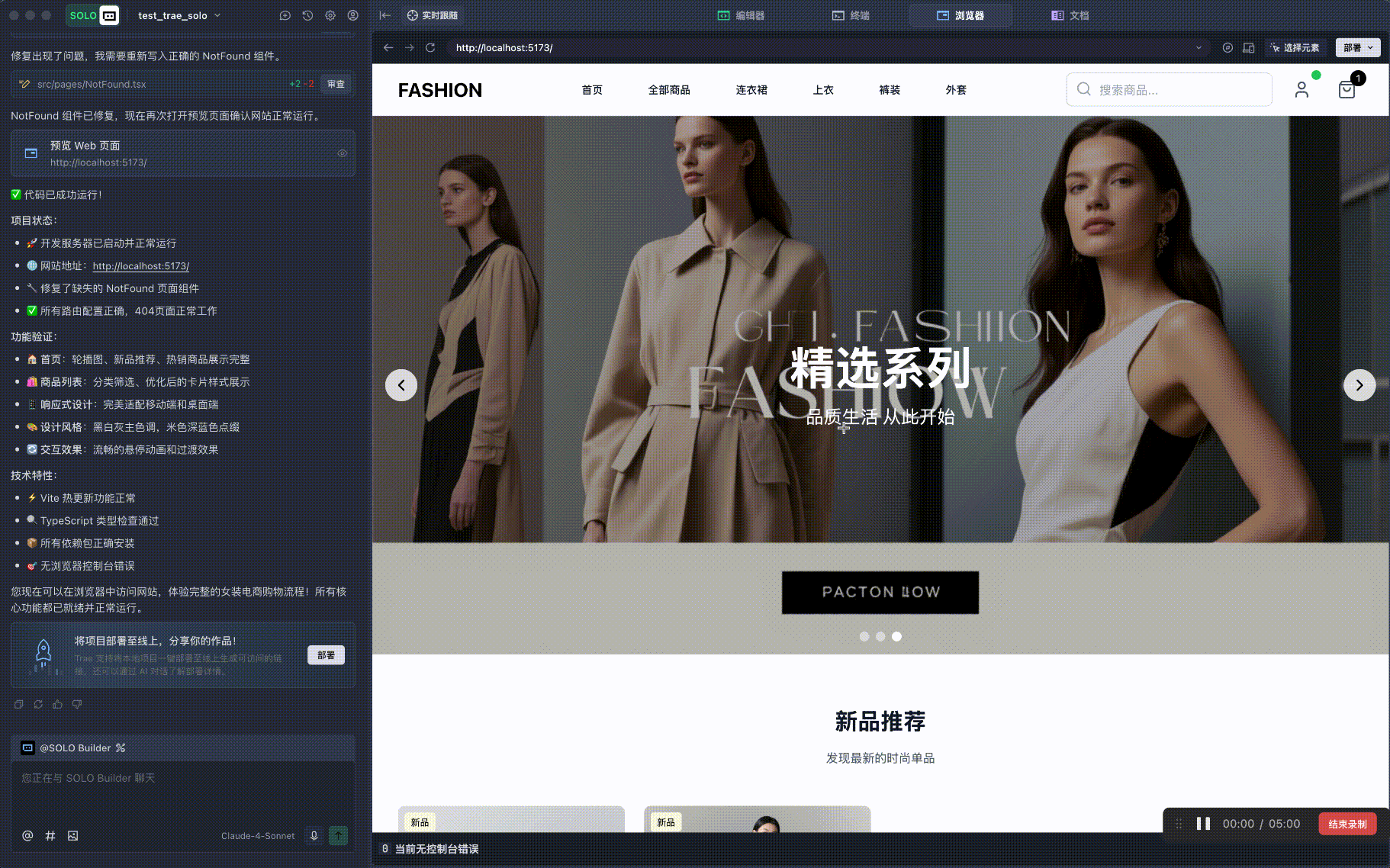 接下来就是花了差不多 5 分钟来一直帮我生成代码,这里我就忽略演示了,等到最后,Trae 突然帮我自动切换到浏览器区域,让我看看它生成的 MVP 产品变成了什么: