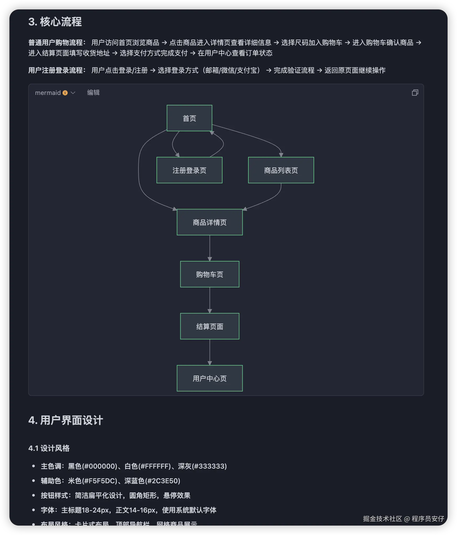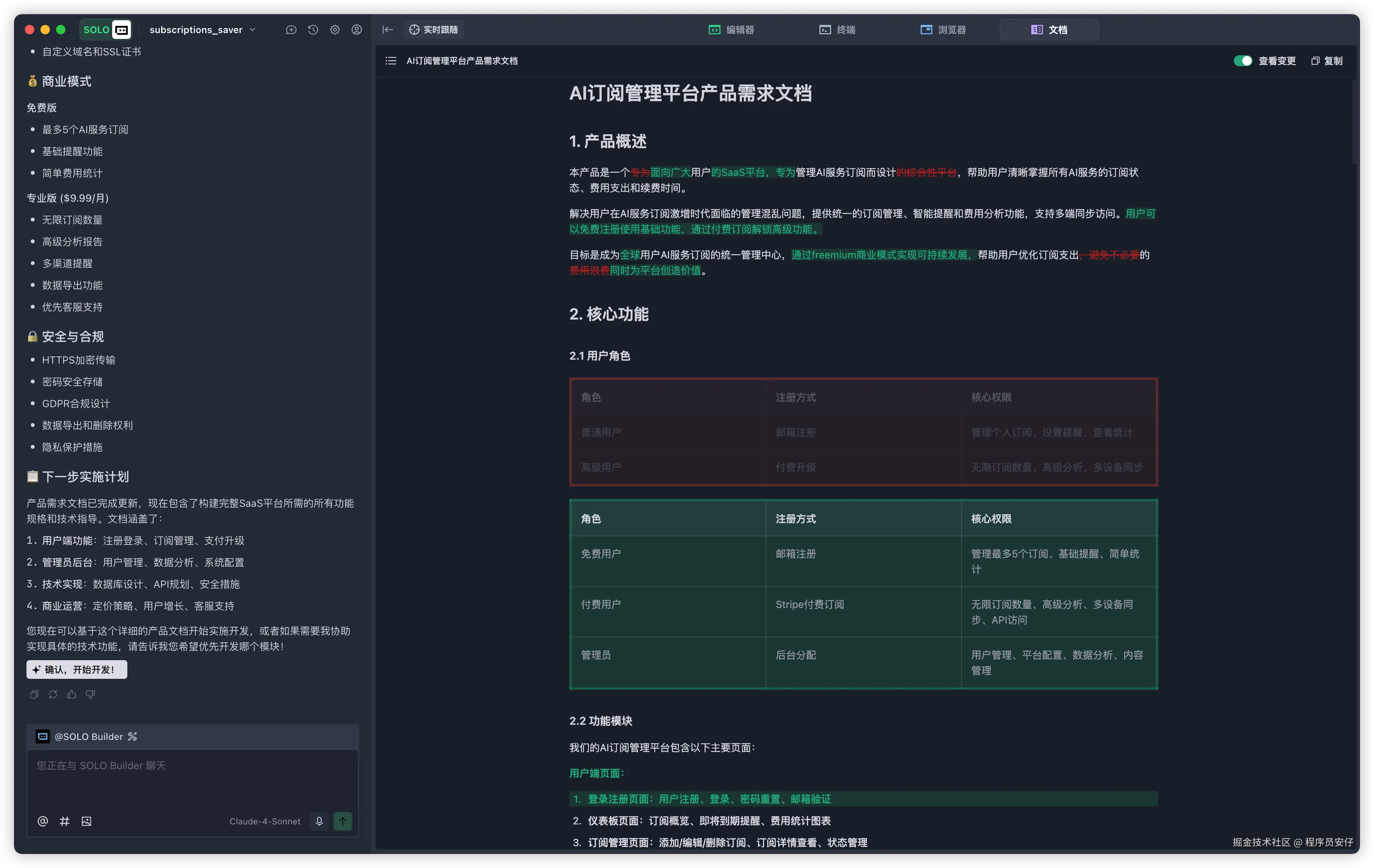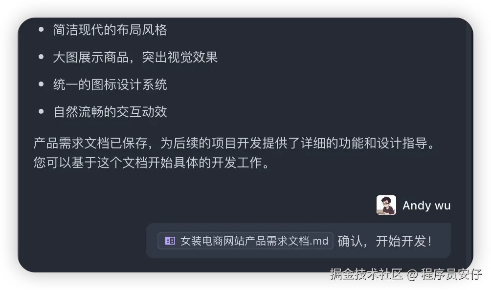 等它完全写好这个需求文档,它会给我过目,让我问我有没什么修改,没有的话,我只需要点击确认,就开始开发了: