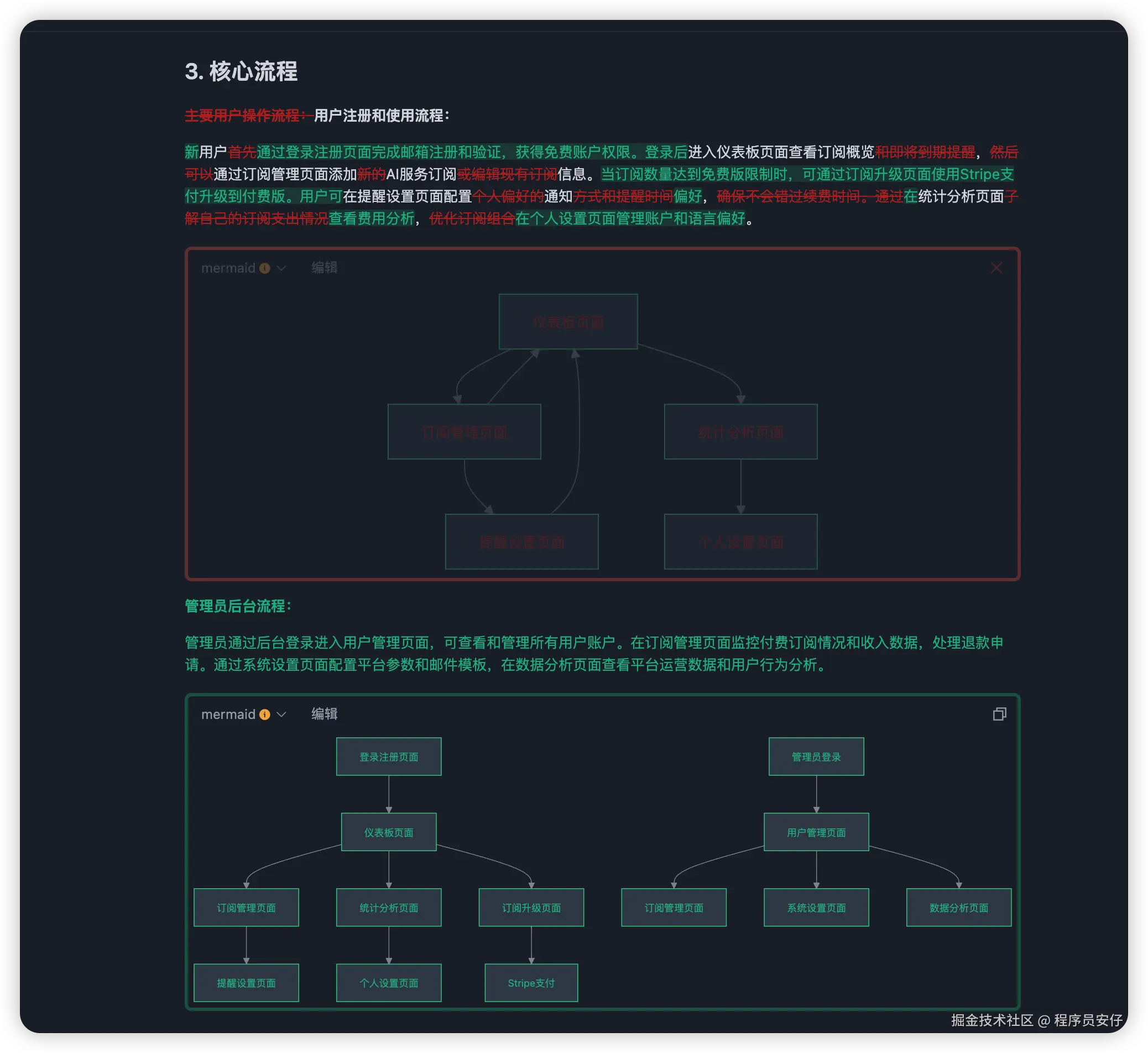 - 之后因为它给我的功能设计与我的想法有些出入,所以我又提了一些修改需求,然后呢,它就直接基于新需求先去修改了需求文档,这时候你会看到,Trae 里面在看这个文档是会有变化差异的,这样可以方便用户知道什么需求是新增的,什么需求是修改的,什么需求是删除的: