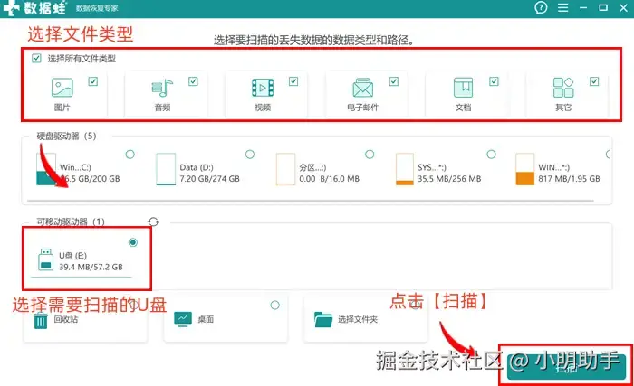 步骤1: 进入软件后,我们就开始在软件的扫描准备页面中选好目标的数据类型和扫描的U盘,选好后按下扫描键就能让软件开始工作了;