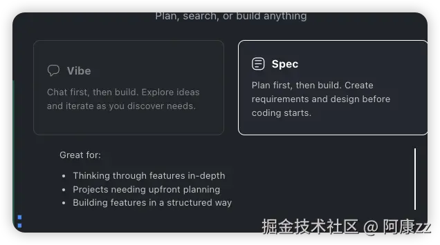 体验一番后,感觉他的设计思路很不错,尤其是 Spec 模式。但我还是 Vibe 模式用的多。