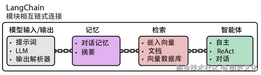 LangChain 作为全功能 LLM 应用框架,其模块化组件可通过链式架构构建复杂的 LLM 系统