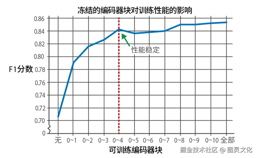 冻结特定编码器块对模型性能的影响。训练更多模块带来的性能提升会快速趋于平缓
