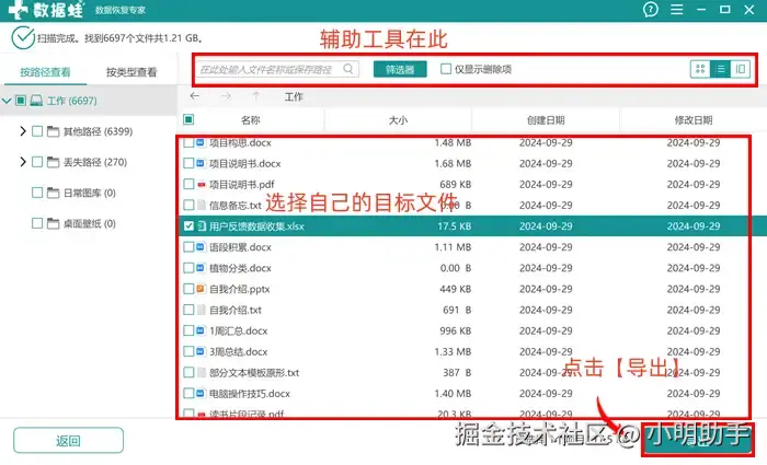 步骤2: 在左上角选择扫描完成后,我们就可以在列表中选择目标文件;找不到文件也不用慌,可以通过页面上方的 【搜索框】、【筛选器】、【文件查看方式】 等工具进行搜索文件数量的减少。找到文件后,直接按下【导出】按钮。