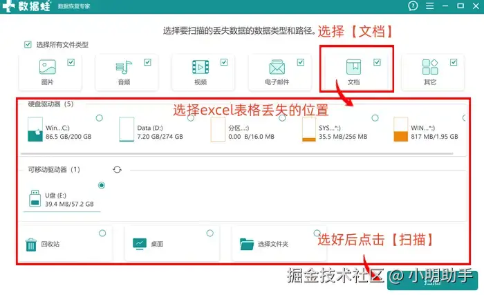 步骤1: 打开软件的首页,在首页上我们找到图片、文档、视频、音频、电子邮件这些文件类型可以让用户进行选择,恢复excel表格我们可以选择【文档】;然后下方的其他栏目中选择Excel表格文件丢失的位置,选好之后点击【扫描】按钮。