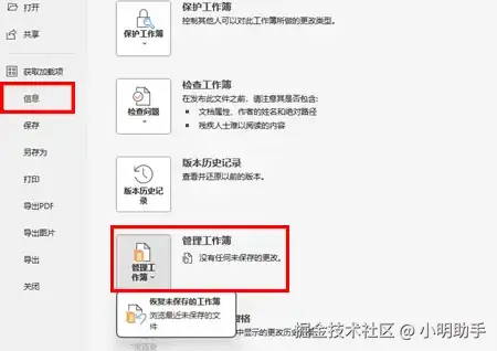 打开excel软件,点击左上角的【文件】后,在左边的栏目选择【信息】,点击【管理工作簿】后选择恢复未保存的工作簿。