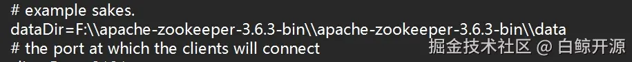 将 conf 目录下的 zoo_sample.cfg 文件复制一份,重命名为 zoo.cfg,修改其中数据的配置,如下: