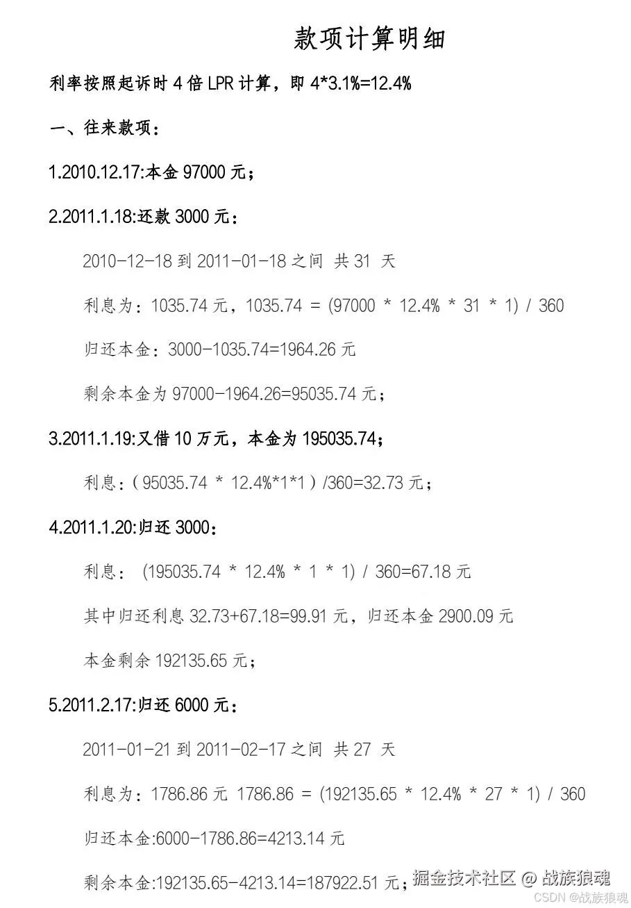 明细表格(每行:起止日期、天数、利息、还款分配等)