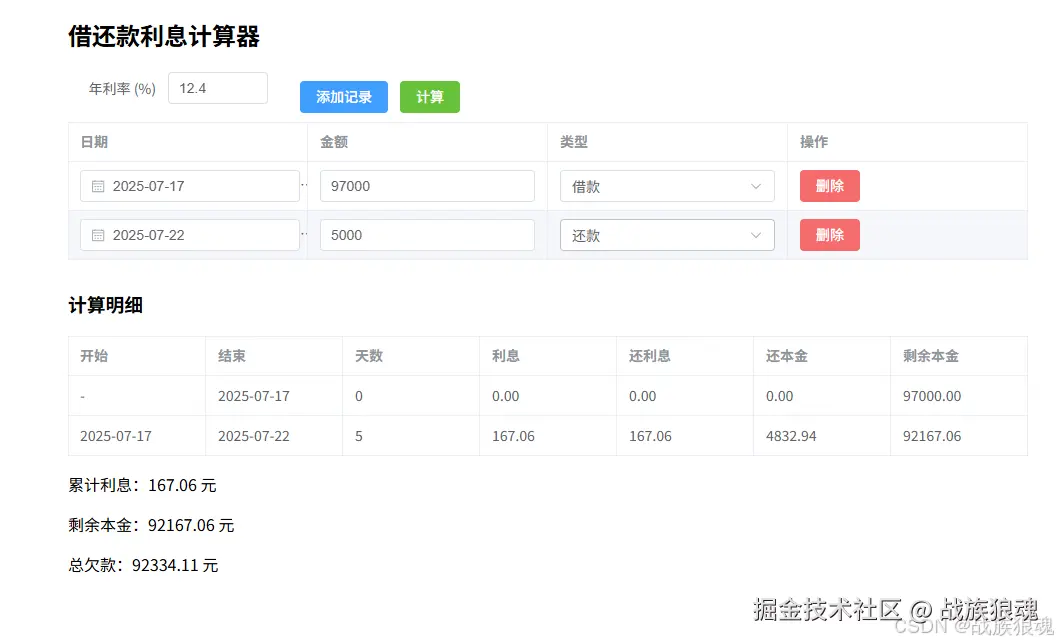 输出:每一笔的明细 + 最终剩余本金、累计利息、总欠款