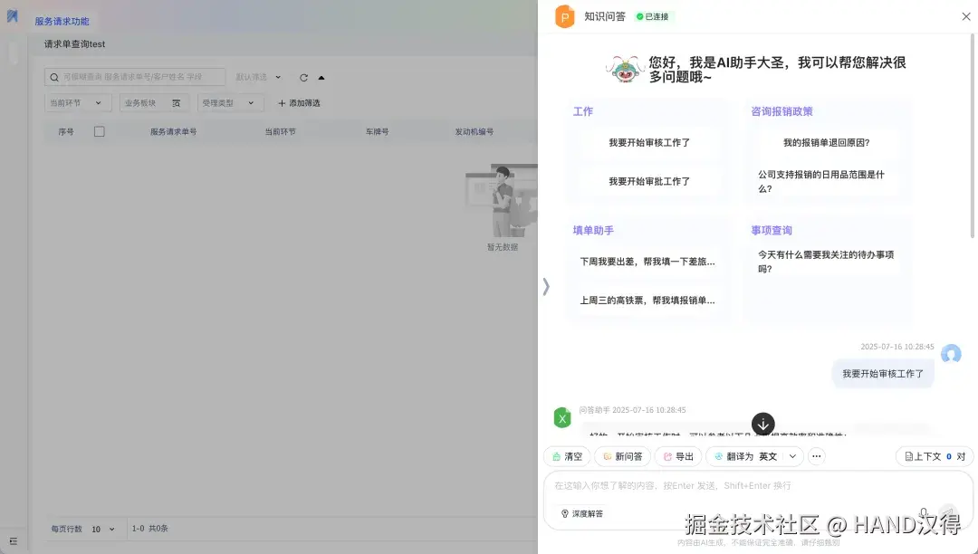 场景示例:在请求单查询页面,打开AI对话框,获得审批流程建议等相关帮助