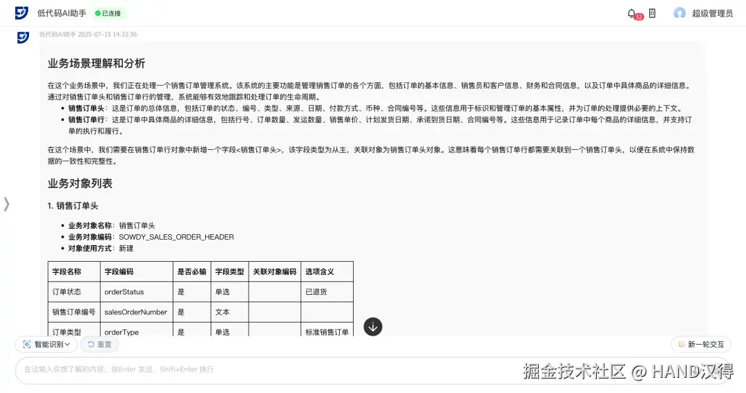 场景示例:根据用户上传的销售订单系统图片,AI可自动解析并生成所需的业务对象和字段,以及它们之间的关联关系