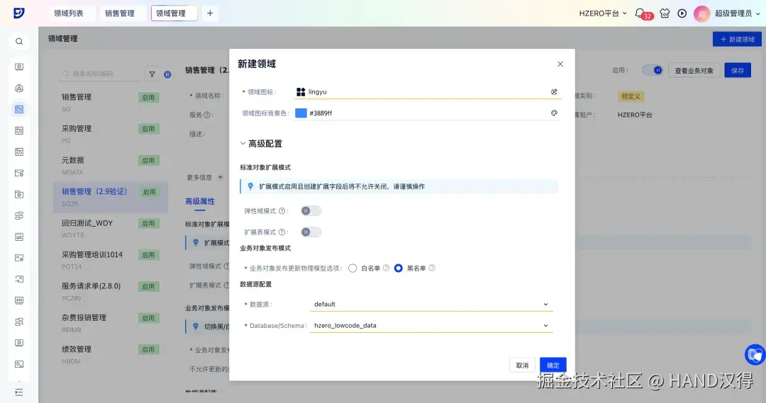 新建领域时支持配置数据源,进行数据源/Database/Schema的选择,为不同领域灵活配置对应的数据连接信息。用户可以根据实际业务需求,将领域绑定到指定的数据源及其下的数据库和Schema,实现数据的分库分表管理