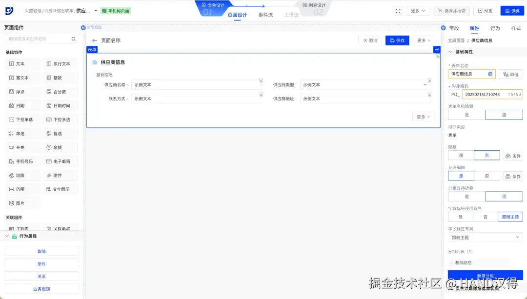 场景示例:通过简单表单快速收集供应商信息,可创建零代码页面,并在页面中拖入供应商信息相关字段