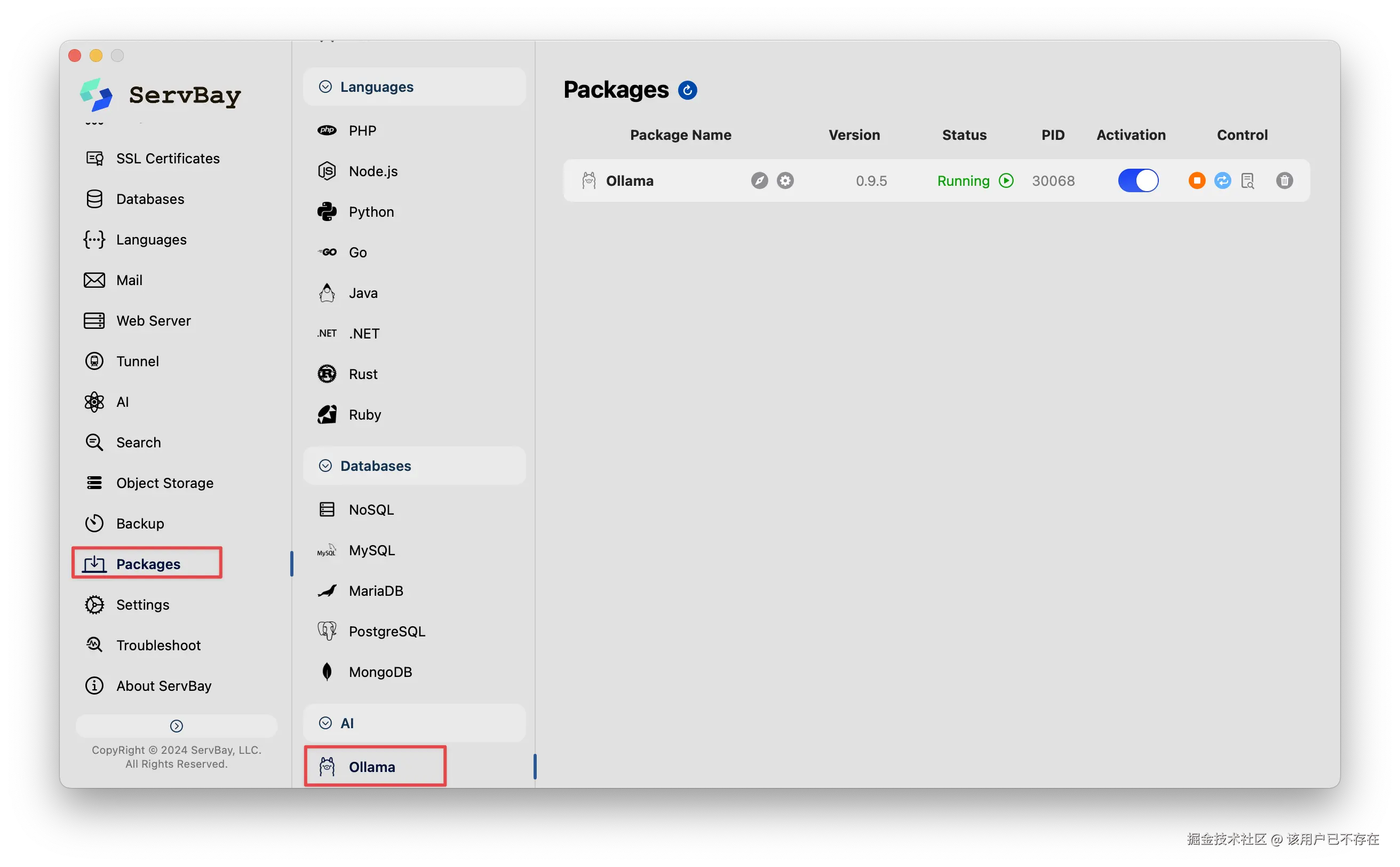 - 安装Ollama: 左侧导航菜单中点击「软件包」,找到Ollama并点击安装。ServBay会自动处理其环境配置。装完成后别忘了点一下激活按钮,启动ollama。
