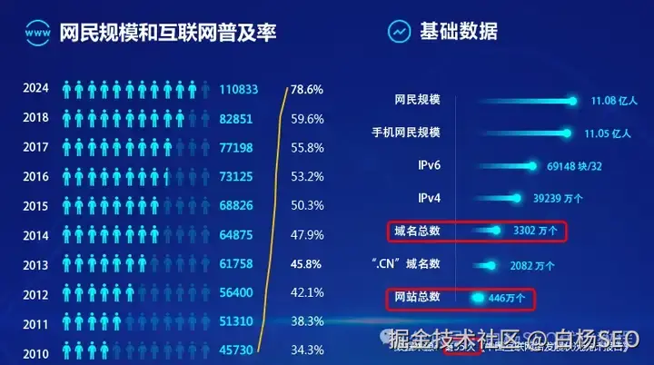 大家看国内从2019年497万个网站,到2023年的388个网站,一直是下降。但从2024年到现在,应该网站总数又回到了2019年左右了。
