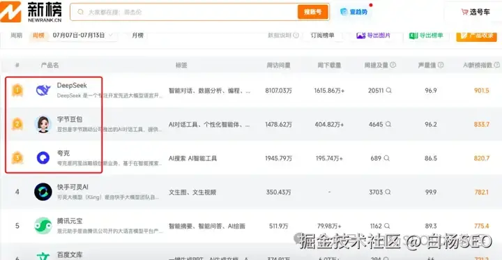 举例,知名新媒体数据分析平台新榜上周AI新榜指数排名截图,前三分别是deepseek、字节豆包、阿里夸克,我相信你肯定手机上有任何一个吧?