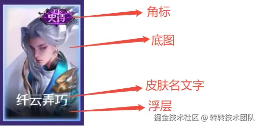 每一个皮肤分类中,各个皮肤单元都由四部分元素组成,分别是角标图片、底图图片、文字、浮层图片。
