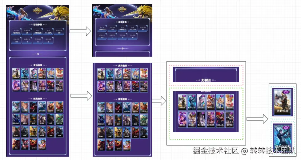 以上文提到的、规则相对复杂的商品详情页大图为例进行说明。通过分析UI原型,我们发现其结构具有清晰的模块化特征:从上往下看依次为基础信息模块、分类皮肤信息模块。其中皮肤信息模块又可分为分类标题模块、单个皮肤单元模块。