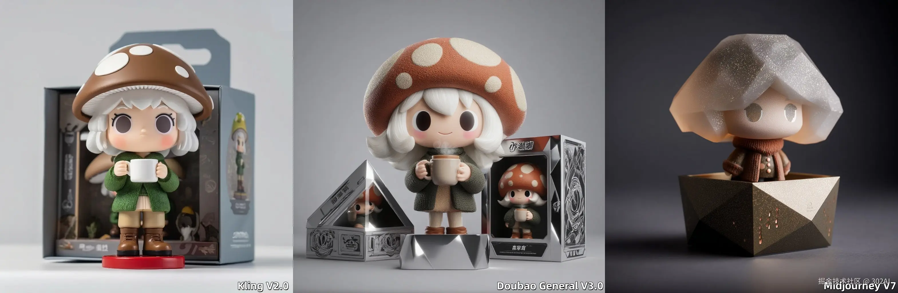 简评:Doubao 表现最佳。 Doubao 生成的包装盒基本符合提示词要求:几何结构,金属感,透明包装礼盒,且保持了角色的一致性,缺点在于包装盒比例与玩偶并不写实。