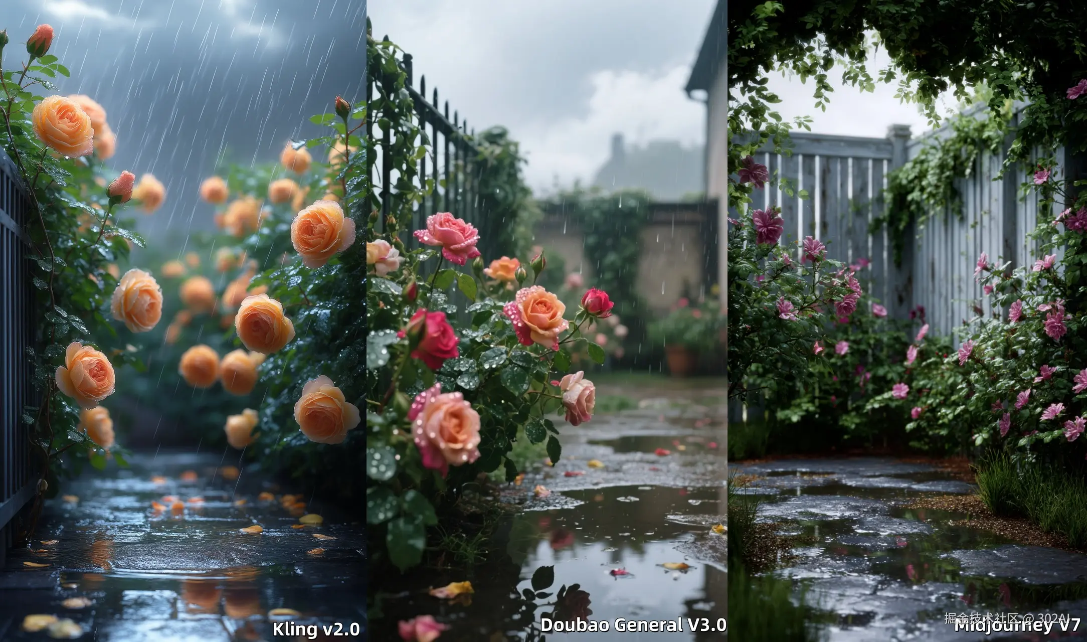 简评:Doubao 表现最佳。 花朵鲜艳,花瓣上挂着水珠,篱笆上的藤蔓,积水倒影,天空灰蒙均准确生成。构图合理,景深虚化自然,花朵的主体能够很好吸引观众视线,相较之下MJ的构图明显空洞。Kling V2.0 存在着虚化生硬,花朵塑料感强等问题。