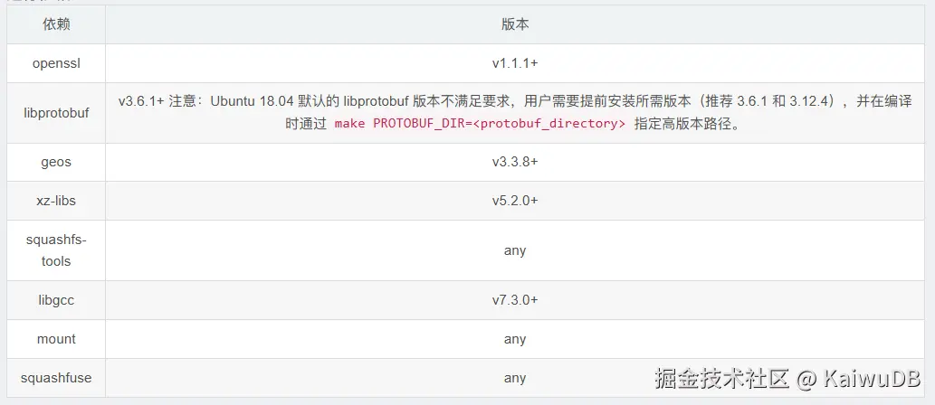• 软件依赖:在 Ubuntu 系统上,需要安装 dpkg - dev、devscripts、liblzma - dev、libstdc++ - static 等依赖。此外,若使用 GCC 和 G++ 7.3.0 版本,还需增加 libstdc++ - static 依赖;对于 Ubuntu 18.04 系统,由于默认的 libprotobuf 版本不满足要求,用户需要提前安装 3.6.1 或 3.12.4 等所需版本,并在编译时通过 make PROTOBUF_DIR= 指定高版本路径。