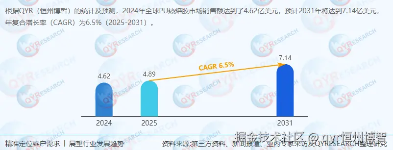 根据QYResearch最新调研报告显示,2024年全球PU热熔胶市场规模达4.62亿美元,预计2031年将增至7.14亿美元,年复合增长率(CAGR)为6.5%(2025-2031)。中国市场增速显著,2024年全球占比约18%,预计2031年将提升至25%,成为全球第二大市场。