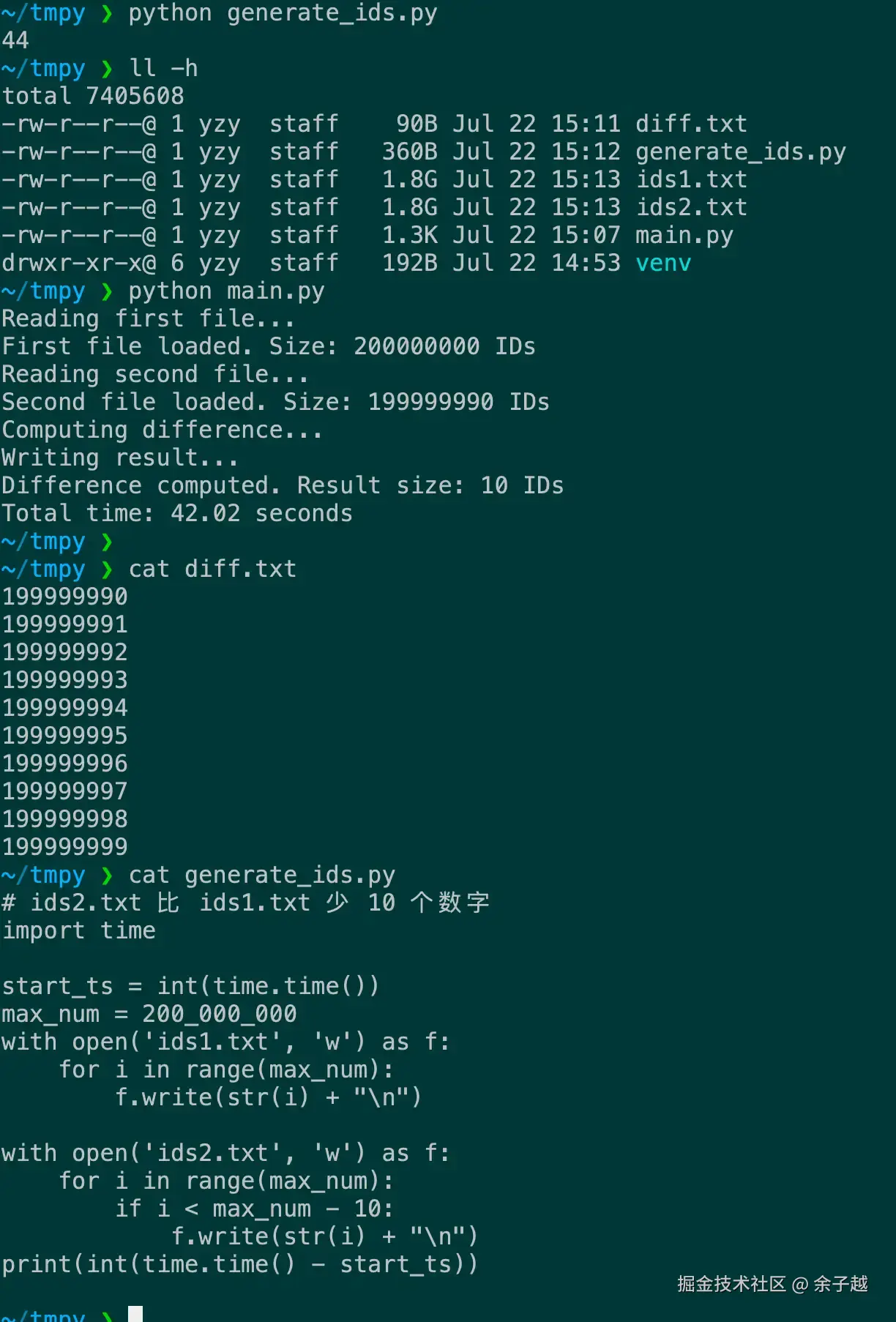 # ids2.txt 比 ids1.txt 少 10 个数字,为了后面能看出差集是多少