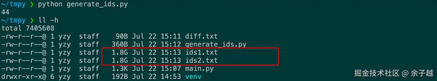 看生成2亿行的2个文件,花了44秒,文件大小 1.8 G