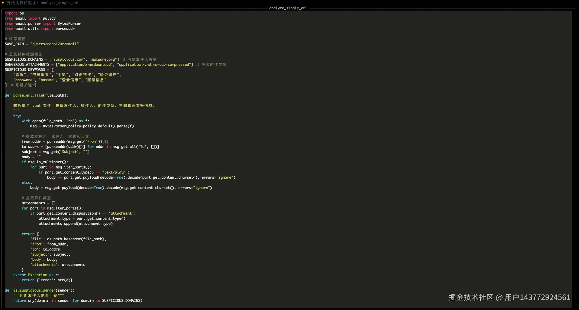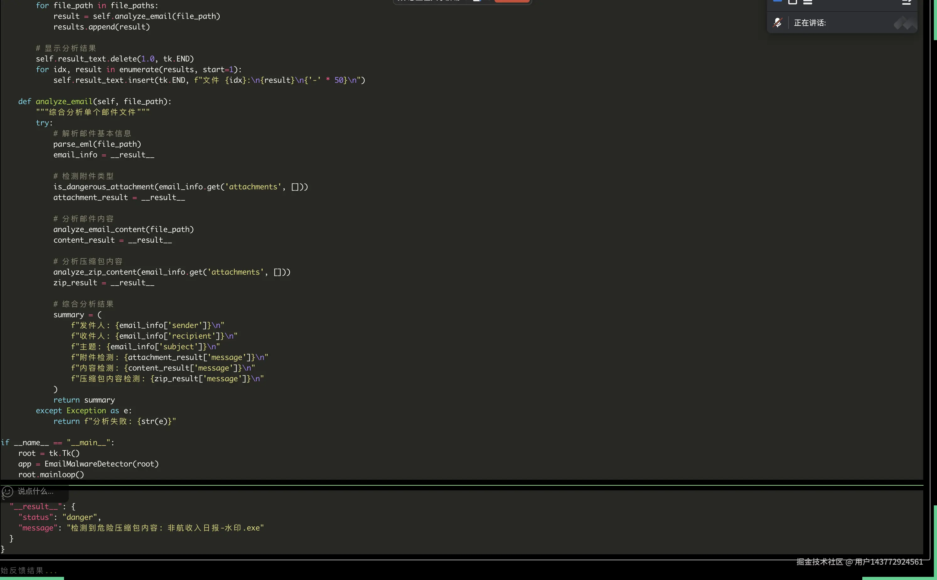 提示词:编写一个恶意邮件监测工具,分析发件人、收件人、附件类型,通过多个维度判断邮件是否为恶意的,支持批量eml倒入分析,检测工具以GUI的形式展现。并保存在/Users/coco17ut/email路径下。