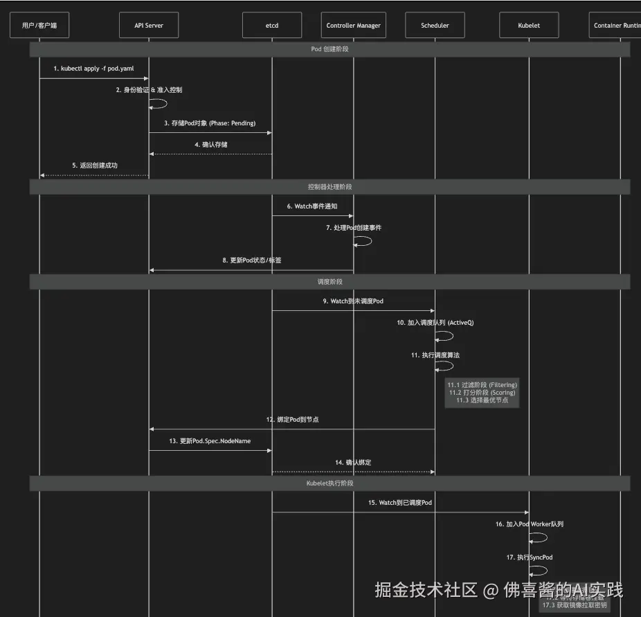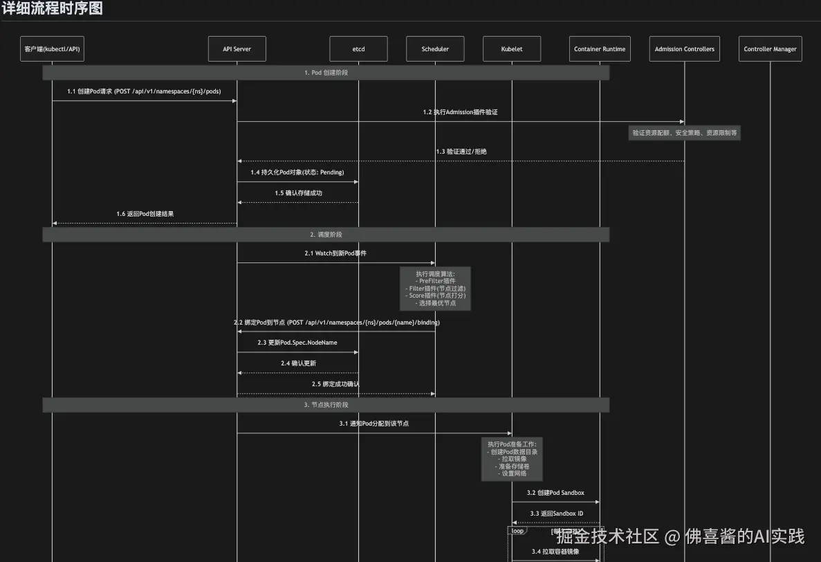 测试问题: "Kubernetes中Pod从创建到调度到节点的完整流程是什么?创建一个时序流程图,同时分析每个组件的作用和可能的失败点,将时序图和分析都输出到一个文档里面"