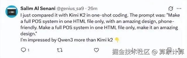 有用户要求“用HTML制作完整的手机端POS系统”,结果Qwen3生成的界面让评测者直言“比Kimi-K2更令人印象深刻”。