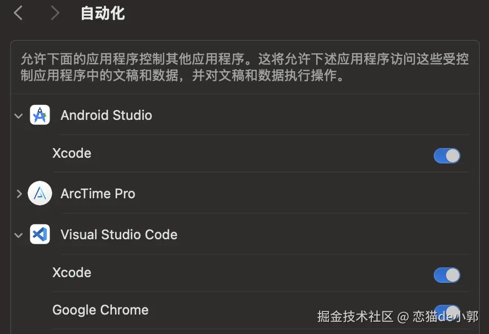 简单说,就是需要安装 Xcode 并且运行时会弹出 Xcode 窗口,还需要用户在 macOS 的“系统设置 > 隐私与安全性 > 自动化”中给予相应的权限 :