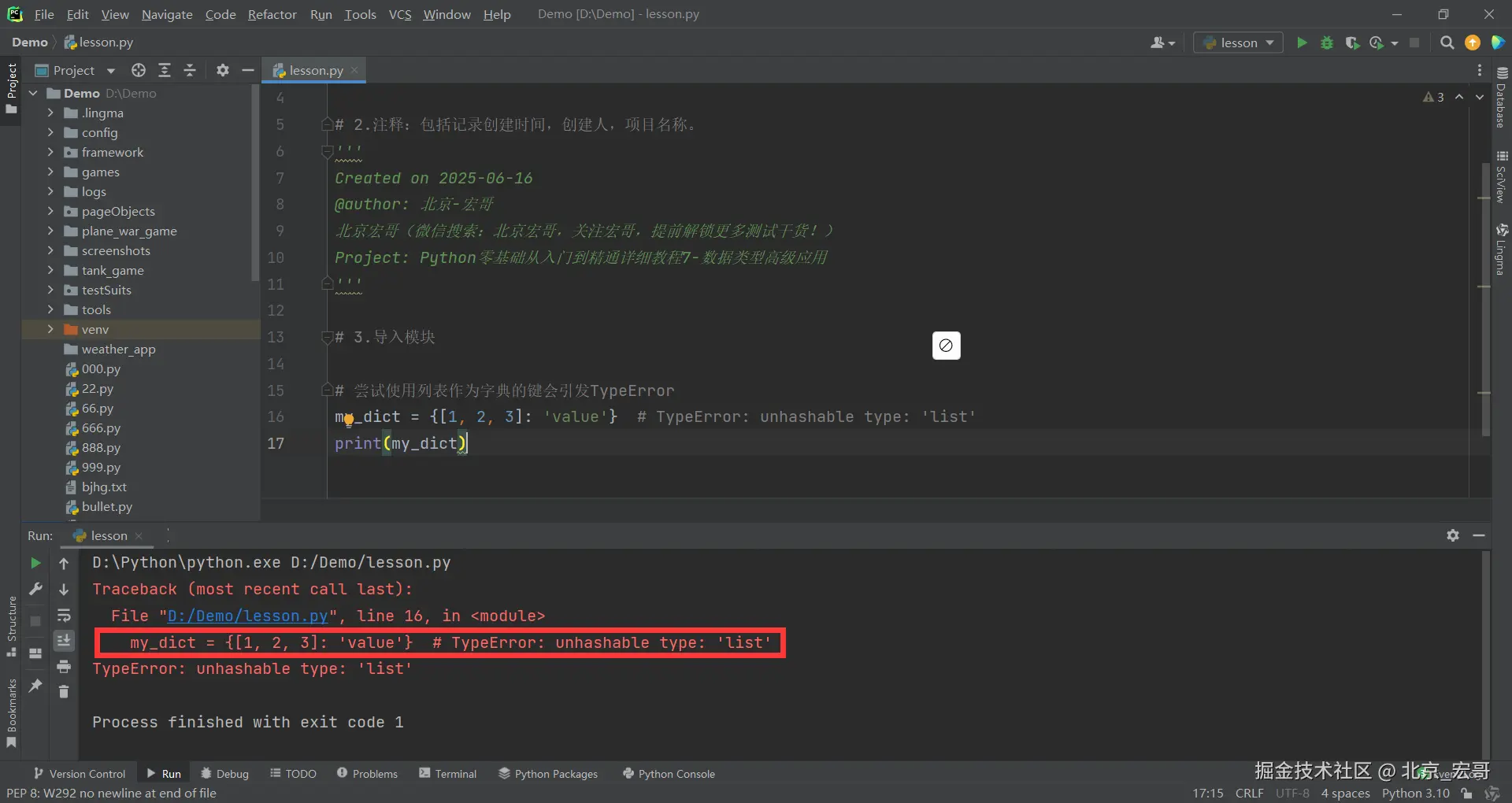 可变对象(mutable objects)由于其值可以在其生命周期内改变,所以它们不是可哈希的。例如,列表(list)和字典自身(dict)是不可哈希的。尝试将可变对象用作字典的键将会引发错误: