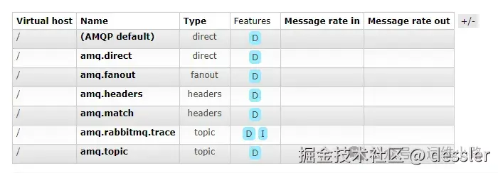每创建一个虚拟主机(vhost),都会默认创建下面的交换机。