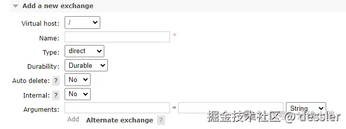 这里实际上就是前面哪些参数,前面提到过交换机具有自动删除就在这里配置,还有是否是内部交换机。Alternate exchange (备用交换机)我们后期讲解死信队列的时候来说。