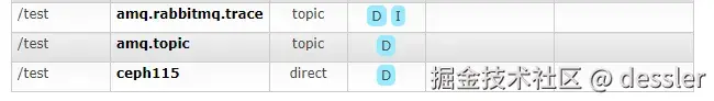 下图的ceph115就是交换机(Exchange),位于虚拟主机(vhost)/test 下,交换机类型是使用最多的直连交换机(Direct Exchange)。