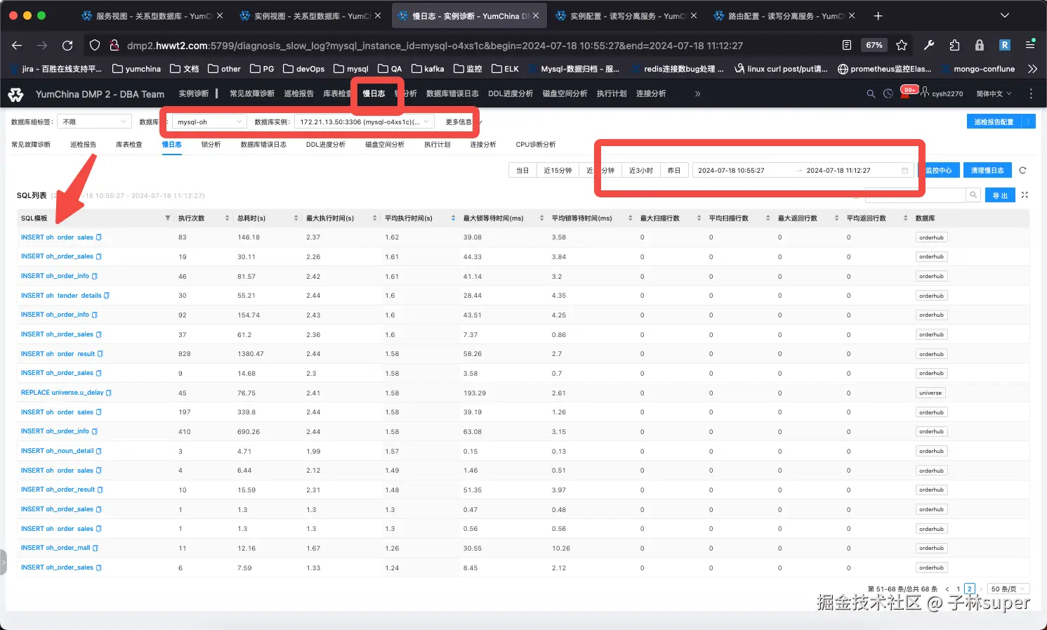 选择组名,找到主库IP,过滤时间,找到异常时间段,查询SQL信息。每一个sql点击后可以查看详细的SQL语句。