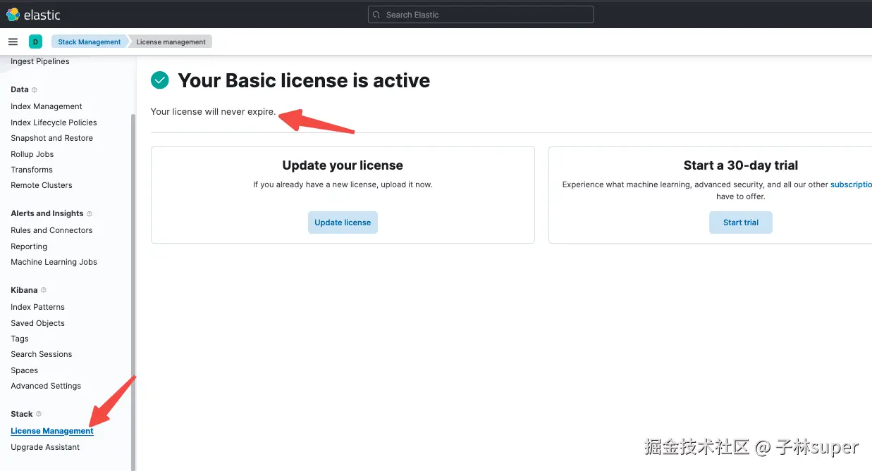 或者借助kibana查看,以下说明license已经自带了,注册license这一步可以跳过。