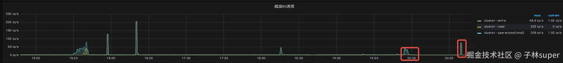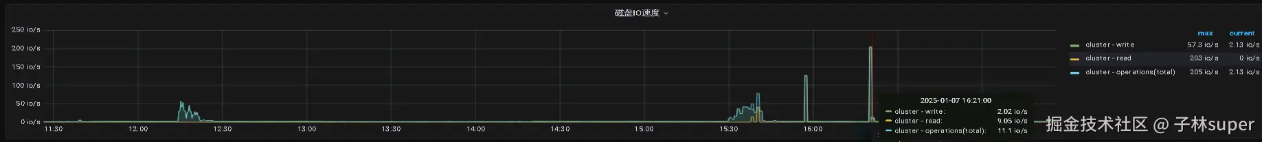 压测时刻的磁盘io:Cluster-read=203io/s cluster-write=1.57io/s